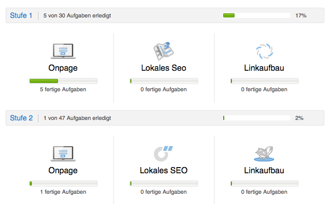 Die Optimierung an sich wird durch das Tool in 2 Stufen eingeteilt. Stufe eins ist hierbei eine Art Basisoptimierung die eine Art Fundament darstellen soll. In Stufe zwei wird es spezieller und schwieriger, aber keinesfalls unmöglich. Die Punkte die abgehandelt werden sind OnPage Optimierung, Linkaufbau und lokale Optimierung.