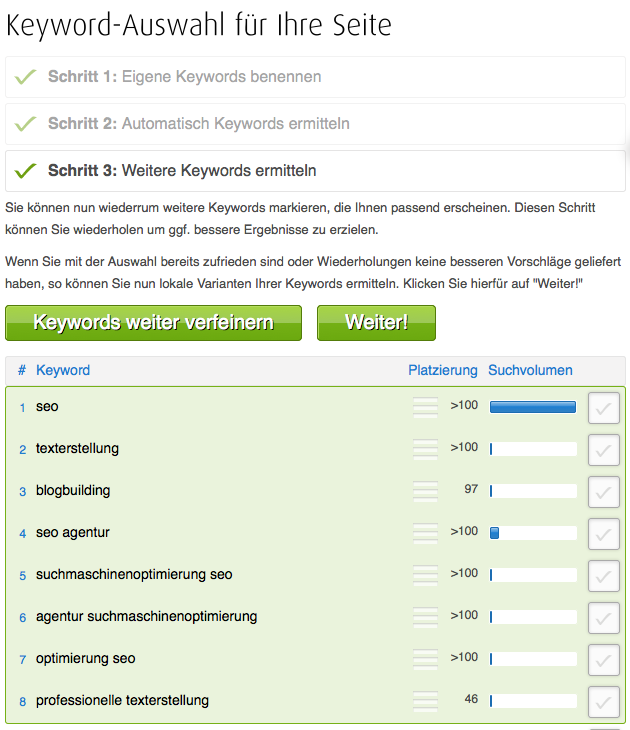 Eine kleine Anmerkung zum Onpage Teil: Das Tool beschränkt sich nicht auf die Startseite. In der Stufe 2 wird die Optimierung von Unterseiten angeboten.