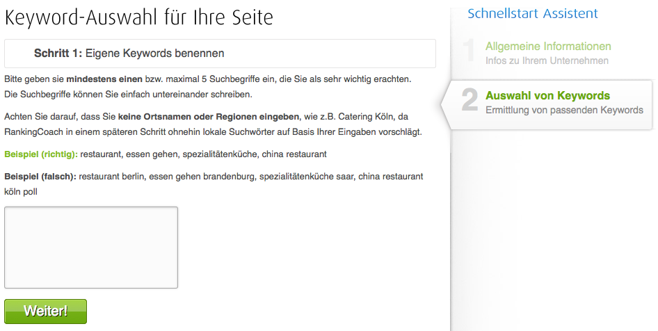 Der Ranking Coach ist kein SEO Tool wie beispielsweise SISTRIX oder die Searchmetric Suite. Es handelt sich beim Ranking Coach eher um eine Step-by-Step Anleitung für Webmaster und Seitenbetreiber, die die Grundpfeiler der Optimierung ihrer eigenen Seite selber in die Hand nehmen wollen. Von Beginn an wird man dynamisch durch das Programm geleitet. Alle Funktionen werden ausführlich und wirklich auch für Laien verständlich erläutert und animiert dargestellt. Nachdem man sich für einen Account angemeldet hat (14 Tage Testzeitraum kostenfrei, danach 24,95€/ Monat), wird man zur Eingabe von SEO-relevanten Daten der zu optimierenden Website gebeten. Hier stellt sich auch aus meiner Sicht bereits das erste Problem dar – ich kann nur eine Domain optimieren. Als SEO Agentur also eher unbrauchbar, da ich regelmäßig mit einer Vielzahl an Kunden zusammenarbeite, aber für ein einzelnes Unternehmen absolut ausreichend. Im ersten Schritt werde ich dazu aufgefordert, die Branche anzugeben in der ich tätig bin und drei direkte Konkurrenten zu benennen. Auch das von mir verwendete CMS kann angegeben werden. Im Nachhinein eine wirklich gute Idee, da das Tool nützliche Plugins und/oder Extensions vorschlägt, die die Optimierungsarbeit deutlich erleichtern.