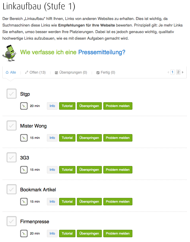 Die Kategorie Linkaufbau ist ebenfalls vorhanden, meine ehrliche Meinung dazu ist aber leider etwas enttäuschend. Es wird einem nur angeraten Links in Portalen zu setzen, wo auch jeder Konkurrent ohne große Probleme Links setzen könnte. Mister Wong oder Firmenpresse. Von einigartigen Links, Linkhubs oder Konkurrenzlinks findet man leider wenig bis garkein Anzeichen.
