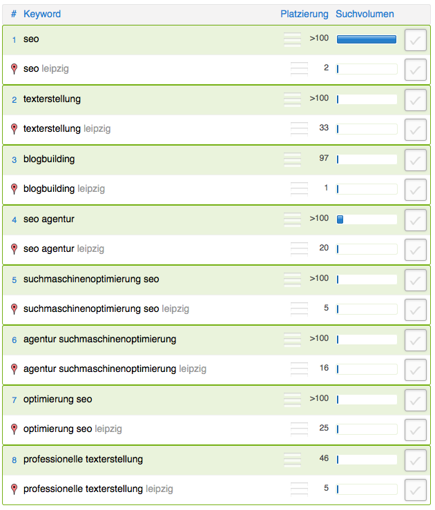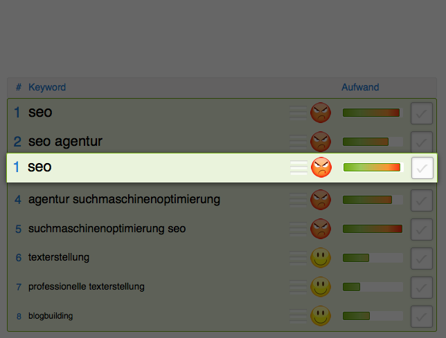 Im nächsten Schritt erhält man eine Liste aus Suchanfragen die sich aus den zuvor gemachten Angaben zusammensetzen. Durch kleine Gesichter wird der Schwierigkeitsgrad der jeweiligen Optimierung aufgezeigt. Auch wenn es eigentlich nichts Besonderes ist, so lockert es den tristen Arbeitsalltag mit den anderen Tools doch ein klein wenig auf.