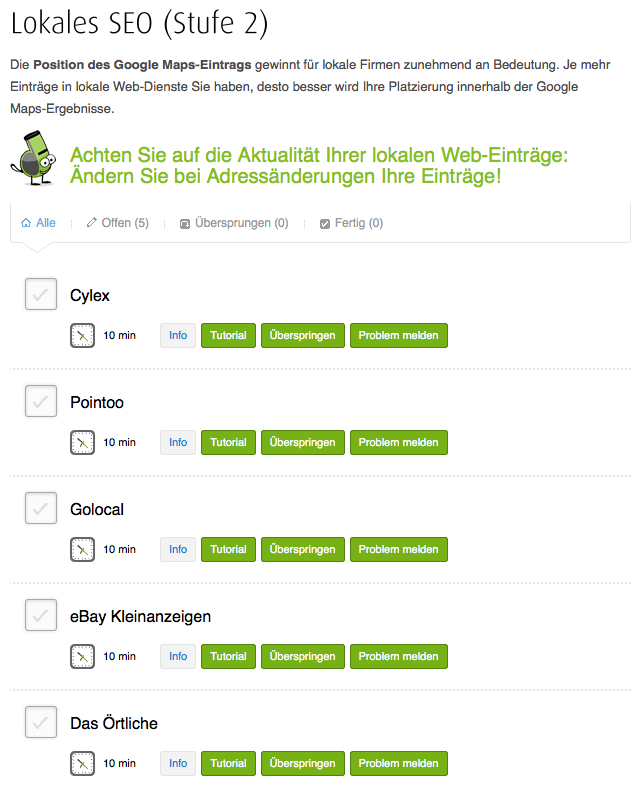 Der Teil des lokalen SEO ist für mich, ebenso wie der Linkaufbau Bereich, ein wenig zu grundlegend gestaltet. Man erhält die Hinweise, sich in regionale Branchenverzeichnisse einzutragen – aus meiner Sicht wenig zielführend. Pointoo…eBay Kleinanzeigen und Das Örtliche…nungut. Maßnahmen wie Google Maps und ähnliche Kaliber werden leider nicht erwähnt – schade. Auch regionale Branchenverzeichnisse, die Seite der Stadt oder regionale Kammern und Verbände wurden freundlicher Weise ausgelassen.
