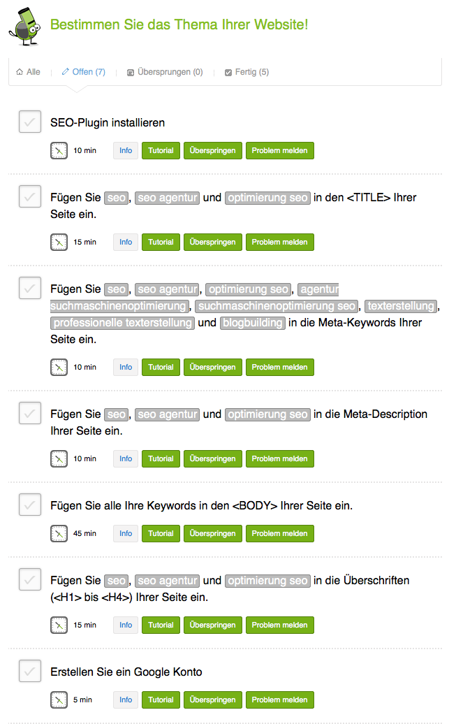 Innerhalb der ersten Stufe der OnPage Optimierung werden alle grundlegenden Parameter wie die Keyworddichte, die Headlines, der Title usw. abgehandelt. Was hierbei ein wenig tricky ist, ist die Tatsache, dass zuvor festgelegte Keywords allesamt mit in den Text, Headline, Title gepackt werden sollen um die Aufgabe zu „erfüllen“. Anscheinend geht es hier wirklich nur darum, eine einzelne Seite zu optimieren, bspw. die Startseite. Inwiefern die Möglichkeit besteht zusätzlich Unterseiten einzutragen kann ich leider nicht sagen, da ich diese Option einfach nicht finden konnte.