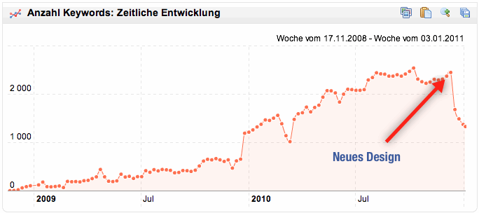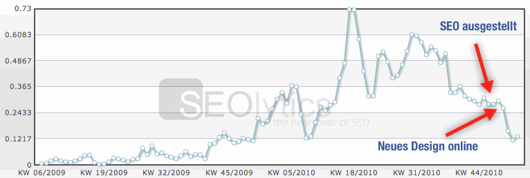 Immer interessant zu sehen wie manche Agenturen und Seitenbetreiber bei der Umsetzung eines neuen Designs einer bestehenden, erfolgreichen Website vorgehen. Von außerhalb kann ich leider nicht in die Gedanken der Leute schauen, was es mir leider auch schwer macht die Hintergründe genau zu erkennen. Nun gab es aber in der ersten Dezemberwoche 2010 mal wieder ein Redesign einer großen Website. Der Grund hierfür könnten die sinkenden Werte im Bereich der Sichtbarkeit in den letzten Monaten gewesen sein. Immerhin probieren viele Seitenbetreiber mit neuem Design auch neuen Aufschwung zu erhalten. Manchmal klappt es, manchmal nicht. In diesem aktuell von mir beobachteten Fall ging es eher in die Hose. Statt Aufschwung gab‘s den Fall. Aber immer der Reihe nach, sonst blickt niemand durch.