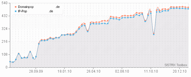 Schon im September 2010 verlor die Seite immer weiter an Sichtbarkeit. Jedoch bleibt die Anzahl der Rankings gleich. Wenn die Sichtbarkeit fällt, aber Top100 Rankings bleiben, ist das ein Hinweis auf verlorene Positionen innerhalb der Top100. Was durch Penaltys etc. begründet werden kann, aber auch einfach durch wachsenden Druck der Konkurrenz.
