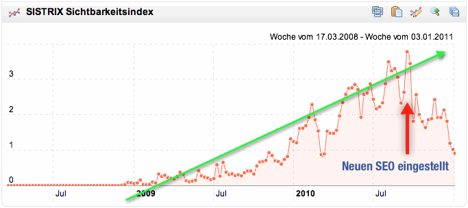 Auf dem ersten Bild habe ich den Zeitpunkt gekennzeichnet, ab dem ein SEO eingestellt wurde. Nicht zu übersehen ist die Tatsache des fallenden Sichtbarkeitsindex. Ich weiß natürlich nicht exakt ob der SEO „vor“ oder „nach“ dem ersten Abrutschen wichtiger Keywords geholt wurde. Wir sehen aber alle das es nichts bracht. Nach drei Monaten hat der SEO laut seinem Xing-Profil die Arbeit wieder beendet. Von 09/2010 bis 11/2010 war er SEO bei der Agentur der betroffenen Website.